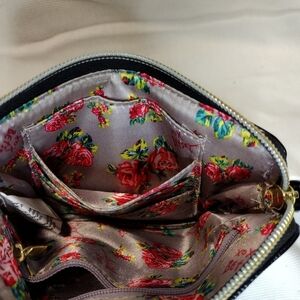 This Betsey Johnson wristlet is black with etching of different sizes and styles of the Betsey Johnson name and features one drop pocket on the outside and has four card slots and one zip pocket on the inside of the wristlet with a floral pattern material. This Wristlet is in like new condition and perfect for a casual or more formal event. It measures 7" wide X 5" tall.