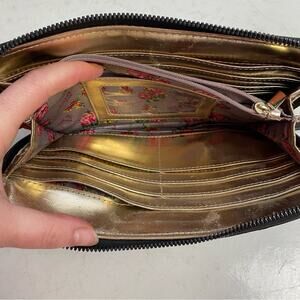 Great used condition! Minor wear on front gold hardware. Lined in pink and purple floral fabric. Several slip pockets and one zippered pocket. One small spot inside of change pouch other than that, interior in excellent condition. Minor wear to outer hardware logo shown in last picture.