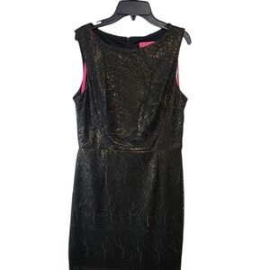 EUC. Striking cocktail dress with unique textured detail, offering a blend of elegance and modern flair. Its classic sheath silhouette is complemented by a sleeveless design and a flattering fit that accentuates the waist. A subtle metallic gold threading is interwoven throughout the fabric to give a hint of shimmer, ideal for evening events and special occasions. Perfect for a chic dinner party, a night out dancing, or a sophisticated wedding reception.