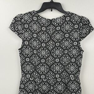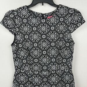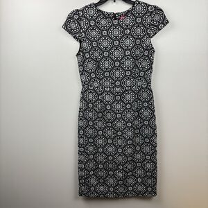 Betsey Johnson Black Gray Medallion Cap Sleeve Knit Sheath Dress Size 8 Stretch