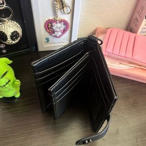 Stylish black wallet with heart pattern. Features a secure clasp and keychain attachment.