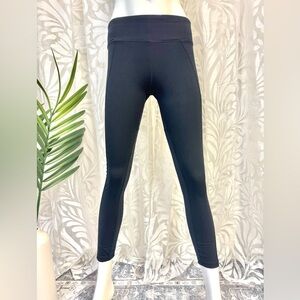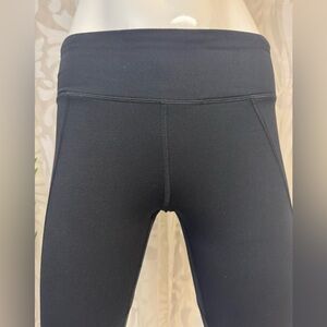 Stylish black leggings with intricate lace design. Perfect for adding elegance to your outfit. Not just for exercise! Wear under tunics! Has front little inside pocket. Betsey Johnson logo on back.