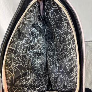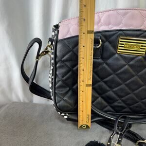 Good preowned condition Betsey Johnson satchel. Pink & black quilted pattern with gold tone hardware and pom pom bag charm. Has handles and removable and adjustable shoulder strap. 100% PVC/Polyurethane. Approx. 14 inches wide by 10.5 inches tall by 4.5 inches deep. Very clean. Has light wear to bottom corners from storage. Fun novelty lining on all pockets. One zippered and three snap closure side compartments.