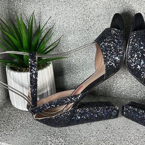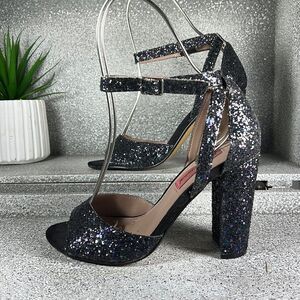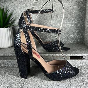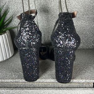 Betsey Johnson Black Rainbow Glitter Glissten Ankle Strap Block Heels