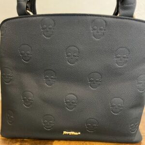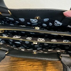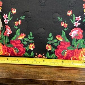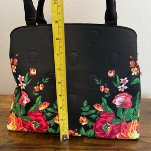 Chic black satchel featuring vibrant floral patterns. Stylish and bold.