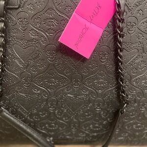 Chic black tote with skull embossing. Features chain detail and sturdy handles. Perfect for edgy style.