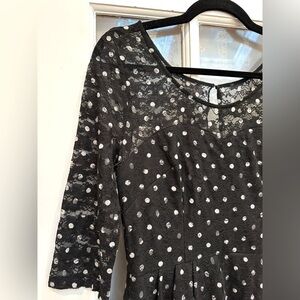 Chic black lace dress with white polka dots. Features long sleeves and elegant design.
