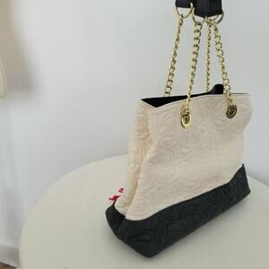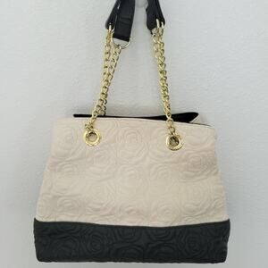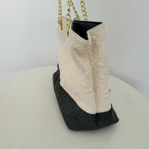 Betsey Johnson Black & White Quilted Rose Satchel Purse w/ Gold Chains Handles Fuchsia Tassel