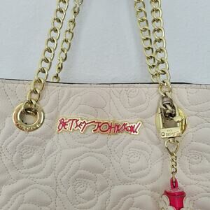 Betsey Johnson Black & White Quilted Rose Satchel Gold Chains Fuchsia Tassel