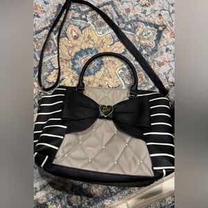 Elegant satchel with a large bow and heart charm. Features striped design and quilted texture. pre owned in great condition