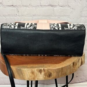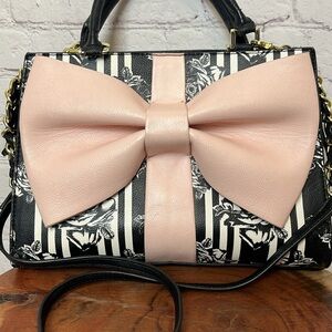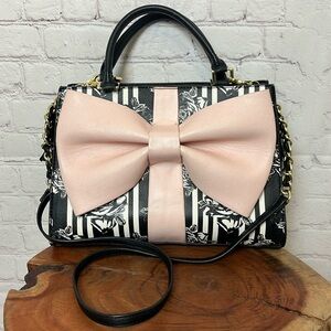Stylish Betsey Johnson bag with a large pink bow. Black and white striped pattern with floral accents. Gold chain details. Perfect for a chic look.