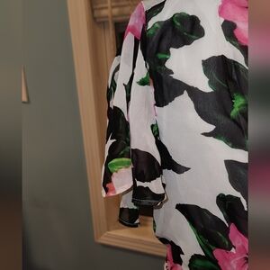Very lightweight, lined, tie belt, hi-low cut with airy flutter sleeves and ruffles at the hem.