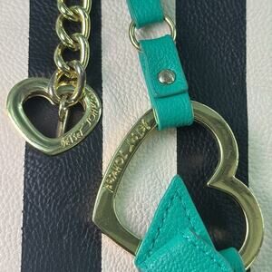 Stylish tote with bold black and white stripes. Features gold heart accents and a teal tassel. Perfect for adding flair to any outfit.
