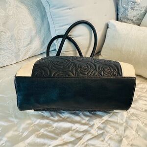 Stylish Betsy Johnson tote with quilted rose pattern. Features black and white stripes. Red heart detail. Includes tassel charm.