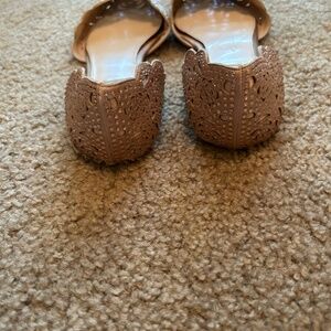 Betsey Johnson "Blue Collection" Rose Gold Lucy Embellished Flats Size 12. This stunning pair of shoes is well-loved, mostly visible on the bottom of the shoe. (All flaws pictured and pricing adjusted accordingly.) I am happy to provide additional photos or measurements upon request.
