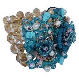 Betsey Johnson Icy Blue Crystal Skull Statement Bracelet 7" Flowers TEAL PATINA