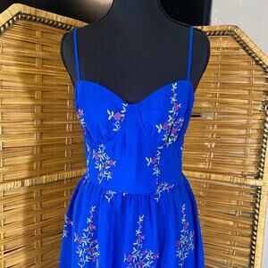 Keywords: Betsey Johnson maxi dress, embroidered floral dress, Y2K festival dress, cobalt blue formal dress, cottagecore, Betsey Johnson corset dress, wedding guest dress, boho chic