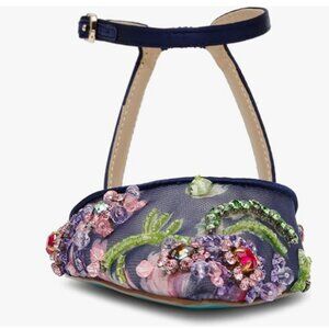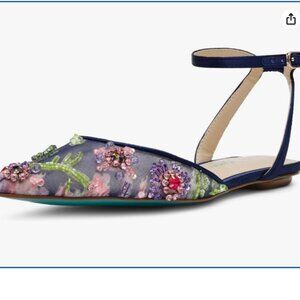 Elegant flats with floral embellishments. Features a blue base with colorful accents. Ankle strap for secure fit.