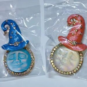 Charming blue moon brooch with a wizard hat. Features gold accents and sparkling rhinestones.