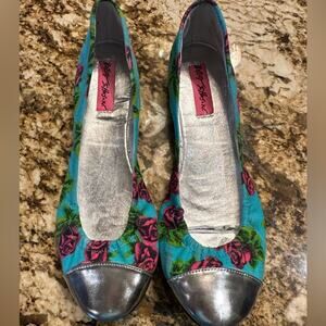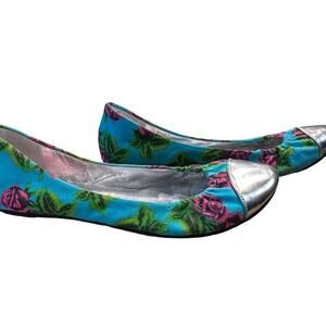 Betsey Johnson Blue, Pink Roses and Silver Womens Size 6.5 Ballet Flats
