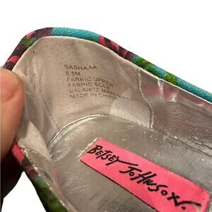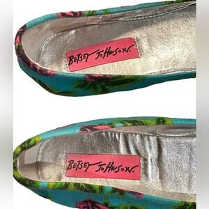 Step out in style with these adorable Betsey Johnson ballet flats! Featuring a delightful combination of blue and pink roses set against a shimmering silver background, these flats are sure to add a touch of whimsy to any outfit. Perfect for adding a pop of color and fun to your everyday look. These flats are in women's size 6.5 and are waiting to dance their way into your wardrobe. Grab them now and let your feet blossom!