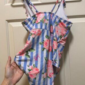 Betsey Johnson Blue Stripe Floral One Piece bathing Suit with Ruffle Trim