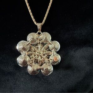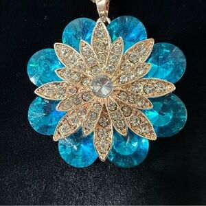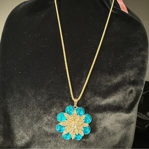 Betsey Johnson necklace showcases a captivating floral pendant with turquoise blue petals and a gold-toned starburst center. The elegant gold chain enhances the vibrant colors, making it a standout piece in any jewelry collection. Absolutely stunning!!!