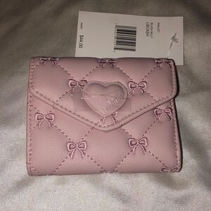 Blush pink faux leather bifold flap wallet features tonal quilted stitched diamond pattern with an embroidered blush pink bow on each side of diamond. Flap with pink enamel heart with Luv Betsey stamped on heart. Flap with snap closure. Inside wallet pink faux leather with clear ID window, bill slot, 2 slip pockets & 4 card slots. Luv Betsey in silver tone foil detailing stamped inside wallet. Black & white striped lining with pink hearts, stars & Luv Betsey printed throughout lining. Dimensions approximately 4.75” inches wide and 4” inches high. Made in Cambodia.
