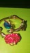 Elegant hinged bracelet featuring a vibrant pink flower and a striking blue crystal. Perfect for adding a pop of color to any outfit.