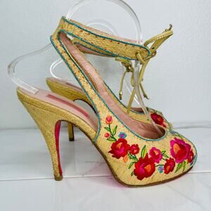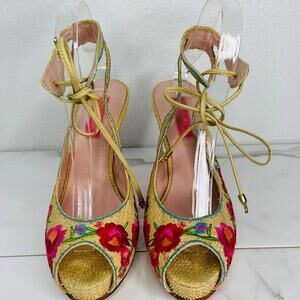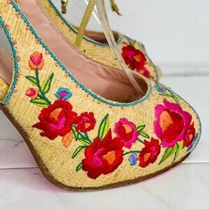 Betsey Johnson Bright Floral Embroidered Heel Peep Toe Sandals Ankle Wrap Tie