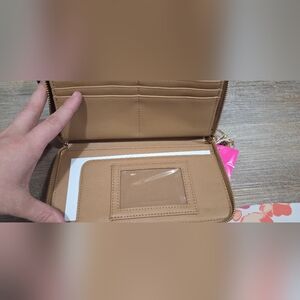 Stylish and fun, this Betsey Johnson wristlet features a playful cowgirl print on a brown background. Perfect for adding a touch of whimsy to your outfit.
