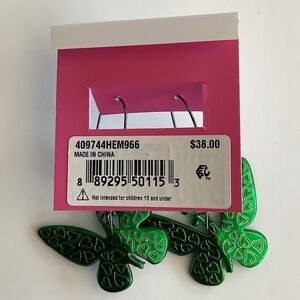 The Betsey Johnson butterfly dangle earrings are sleek long ear wire with vibrant green butterflies adorned with colorful spots and minimal stone accents