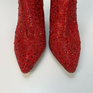 red rhinestones, glittery ankle boots, statement footwear, shiny booties, party shoes, heel boots, embellished footwear, sparkly heels, bold accessories, club wear
