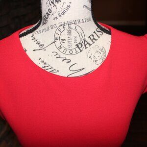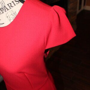 Betsey Johnson Tangerine orange sheath dress. Pleated cap sleeves. Hidden back zip closure. Kick pleat in the back. Fully lined. 97% Polyester 3% Spandex. Dry Clean. 38 1/2 inches from shoulder to hem.