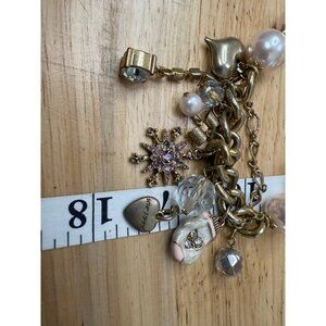 Crafty and eclectic, this Betsey Johnson charm bracelet features pearls, gold-tone chains, and rhinestone accents. Ideal for repairs or creative repurposing.