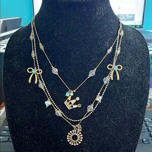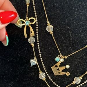 Betsey Johnson Charm Necklace Goldtone Crown Bows 3 Tiers Lobster Clasp