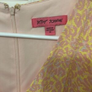 This is a Betsey Johnson cheetah print dress in a size 10. It is pink yellow and light blue. The shell is 98% polyester 2% spandex. The lining is 100% polyester.