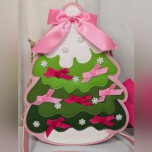 Betsey Johnson pink and green crossbody bag shaped like a Christmas tree decorated with pink bows and glitter.