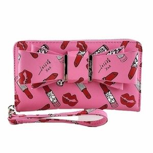 Betsey Johnson Clutch Wallet Zip Around Barbie Pink Lipstick Bow Faux Leather