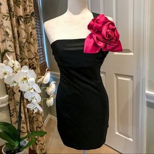 This super sexy little number by Betsey Johnson Collection is the perfect little black satin dress with 🌺 Flower Power!