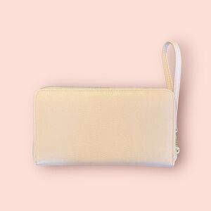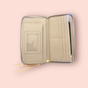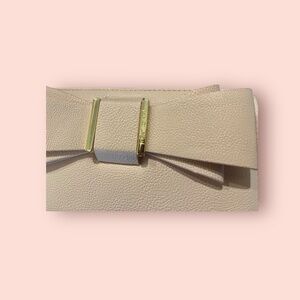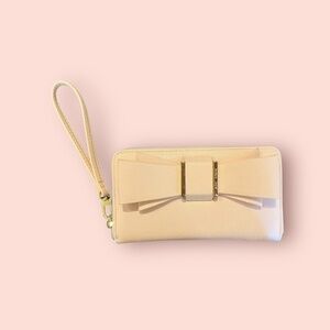 Betsey Johnson wristlet wallet in nude/cream with oversized bow and gold-tone logo hardware. Zip-around style with detachable wrist strap. Multiple card slots, ID window, cash compartments, and zip coin pocket. Versatile as a clutch or everyday wallet. Gently used, minor wear—see photos.
