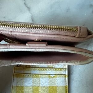 Stylish and compact, this Betsey Johnson wallet features a chic cream and pink checkered design. Perfect for keeping your essentials organized with a touch of elegance.tag is missing