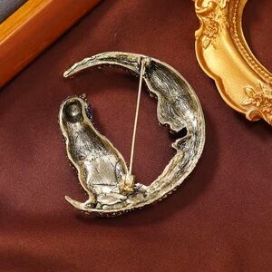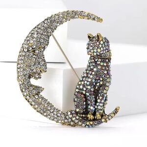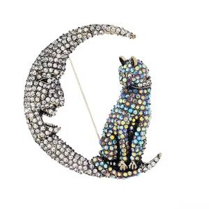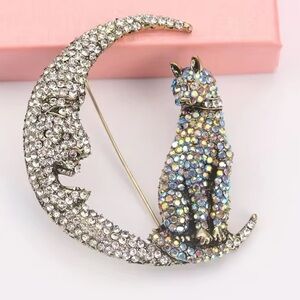 Elegant brooch featuring a sparkling cat and moon design. Perfect for adding a touch of glamour to any outfit.