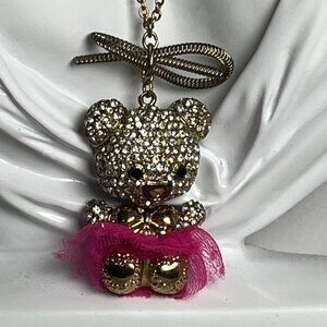 Betsey Johnson Crystal Teddy Bear ballerina gold magenta Pendant Necklace 28"