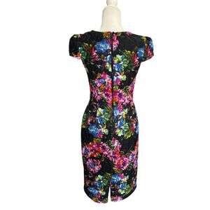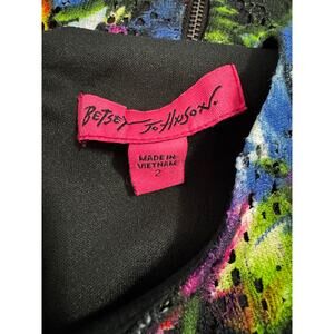 Vibrant and playful Betsey Johnson floral sheath dress featuring a black lace overlay with multicolor abstract floral print. This fitted silhouette flatters the figure with cap sleeves, a crew neckline, and a back zip closure. Fully lined for comfort and structure. A perfect choice for cocktail parties, weddings, or date nights — classic Betsey with a bold modern edge.