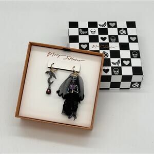 New Betsey Johnson Dark Magic mismatched skeleton bride earrings featuring a black skeleton bride and a bat with a red iridescent crystal.