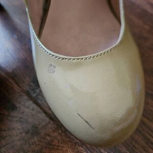 This is a pair of the Dita style platform heels by Betsey Johnson. They're beige and have pink floral bottoms. The back of each heel features a corset style lace up detailing. Note some wear on these shoes as shown in the photos.