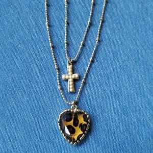 This is a Lovely Heart & Cross Necklace by Betsey Johnson. The Large Cat Print Lucite Heart is on the Longer Chain, and the Cross is on the Shorter Chain. The Cross is embellished with small faux Pearls (the back of the Cross has the initials, "BJ."). The Iconic Betsey Johnson / BJ heart is present. Gold-tone Hardware. Lobster clasp closure.