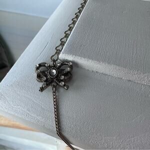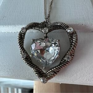 Double heart necklace with large crystal center heart and flanked by 2 bows from Betsey Johnson.