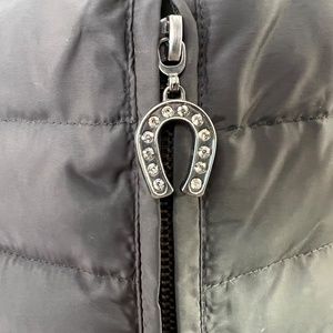 This is an adorable down puffer jacket! The double breasted button snaps add a flare you don't find in other down wear. The bell sleeves add another delightful spark to this piece. Tailoring creates a silhouette that is accented by the back lumbar buttons. The interior is super cute, reminding you to have fun and enjoy. And of course, a horse shoe for luck!